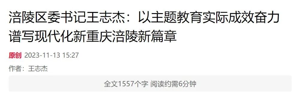 11月13日,七一客户端发表了涪陵区委书记王志杰署名文章《以主题教育实际成效奋力谱写现代化新重庆涪陵新篇章》,关注了涪陵区牢牢把握学习贯彻习近平新时代中国特色社会主义思想主题教育总要求和目标任务,切实把主题教育成果转化为攻坚克难、干事创业的强大动力,谱写现代化新重庆涪陵新篇章。