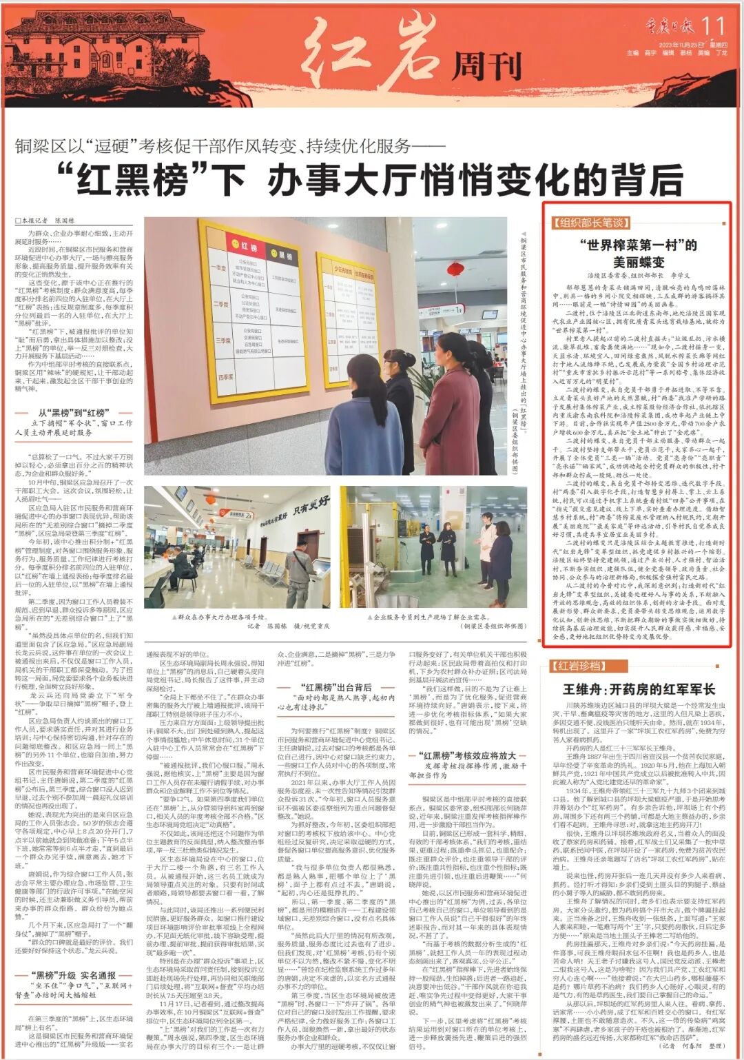 11月23日,重庆日报刊发《“世界榨菜第一村”的美丽蝶变》,关注了“世界榨菜第一村”涪陵区江北街道二渡村的美丽蝶变。