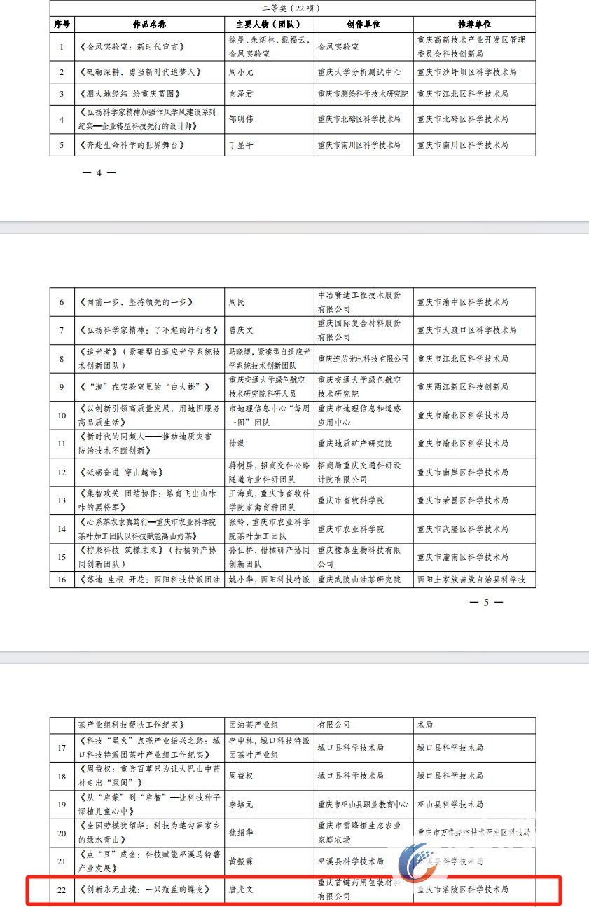 重庆市渝东南农业科学院创作的短视频作品《“稻田守望者”》,时长5分49秒,视频中介绍了水稻育种专家张致力研究员,一生致力于保障国家粮食安全,从事水稻育种工作38年,不间断不放弃,为了中国的老百姓能将饭碗牢牢端在自己手里而奉献一生、矢志不渝的科学家精神。首键药包创作的视频作品《创新永无止境:一只瓶盖的蝶变》时长4分钟,以首键药包创始人、总工程师唐光文为主要对象,记录了首键药包走自主创新之路,敢为人先、攻坚克难,颠覆性技术革新解决行业产品“卡脖子”难题的事迹,展现了企业科研工作者勇攀高峰、敢为人先的创新精神。