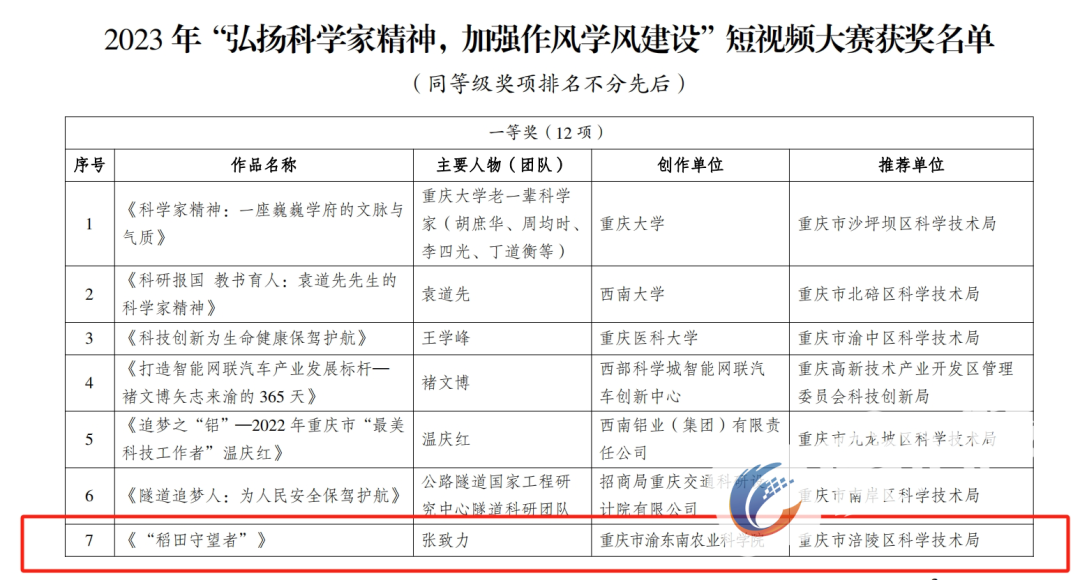 近日,重庆市科学技术局公布了2023年“弘扬科学家精神,加强作风学风建设”短视频大赛获奖名单,涪陵区有2个作品上榜。