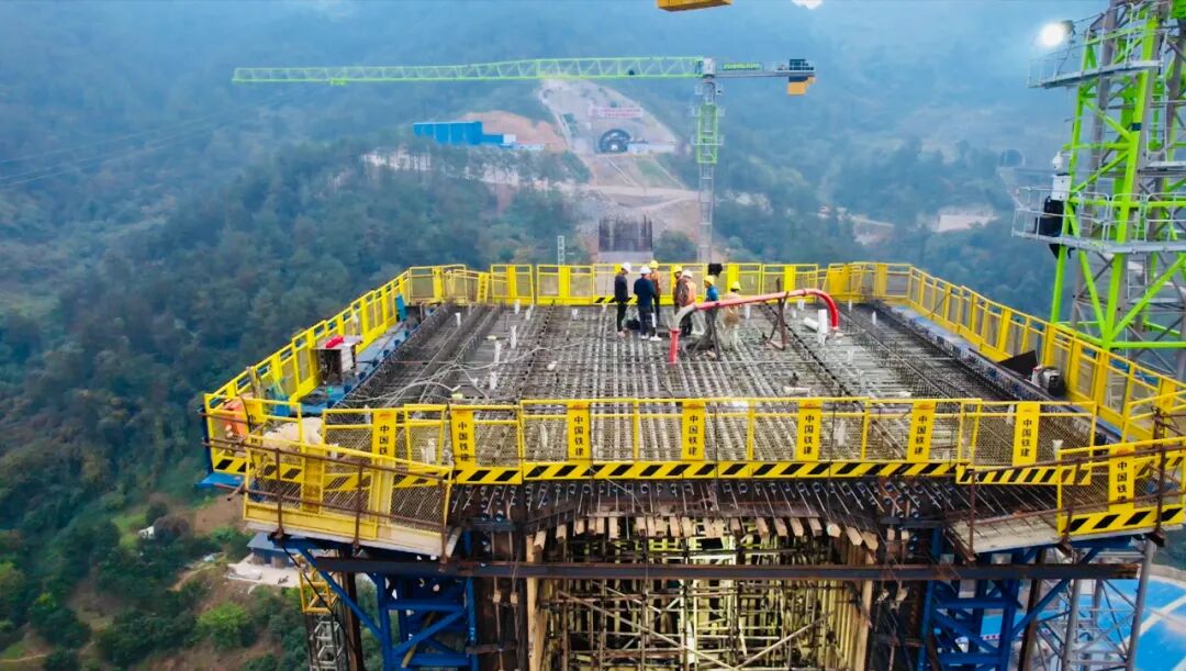 作为渝万高铁的重难点工程之一,蔡家沟双线特大桥全长2113米,全桥总共有59个桥墩,3个桥台。其中15号、16号墩墩高150.5m,是渝万铁路全线最高墩,也是目前国内在建同类型工程的最高墩。本次浇筑的0号块,桥面宽12.6m,梁高6.6m,总方量为336立方米,采用泵送混凝土进行浇筑作业。0号块浇筑完成后,接下来将进入挂篮拼装施工,以及后续阶段施工。整个蔡家沟双线特大桥连续梁计划2025年5月份合龙。