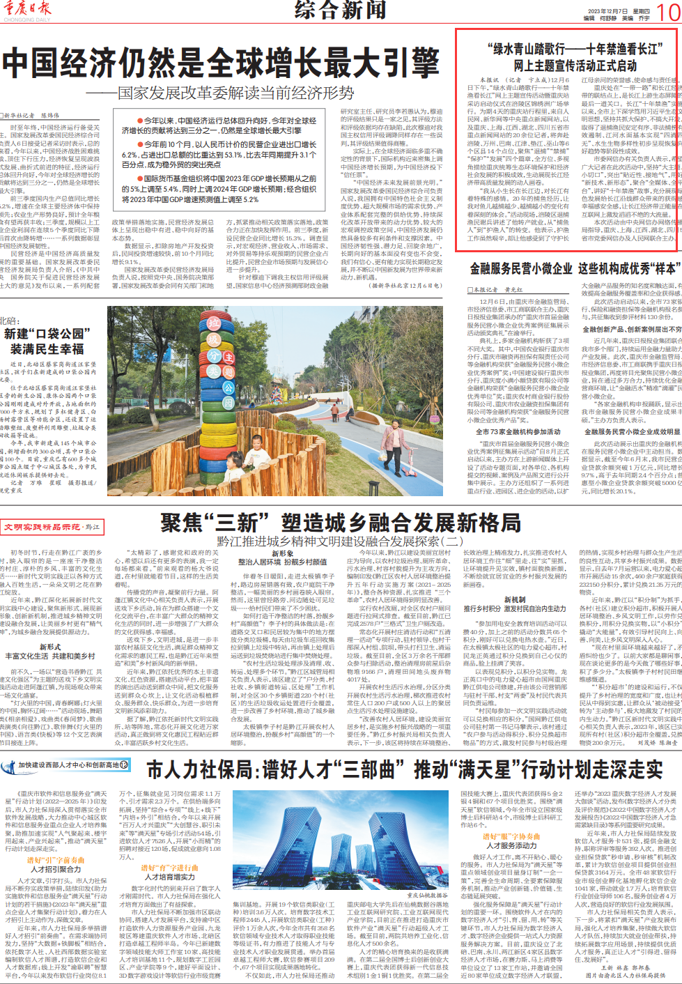 12月7日,重庆日报刊发《“绿水青山踏歌行——十年禁渔看长江”网上主题宣传活动正式启动》,关注了涪陵统筹生态环境保护和经济社会发展的积极成效。