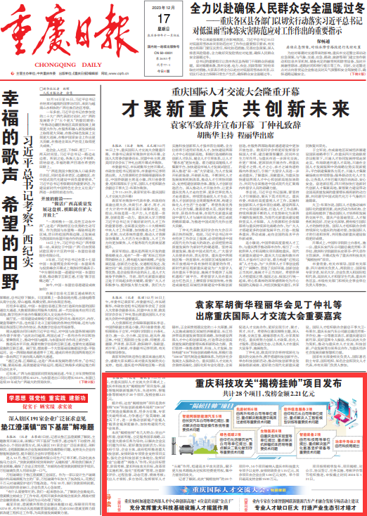 12月17日,重庆日报头版报道《重庆科技攻关“揭榜挂帅”项目发布 共计28个项目 发榜金额2.21亿元》,其中,由中石化涪陵页岩气公司等单位提出的2项绿色低碳项目上榜。