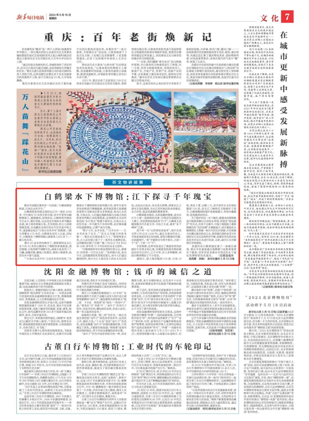 5月16日,新华每日电讯刊发《白鹤梁水下博物馆:江下探寻千年瑰宝》,关注了“世界第一古代水文站”“世界首座非潜水可到达的水下遗址类博物馆”白鹤梁水下博物馆。