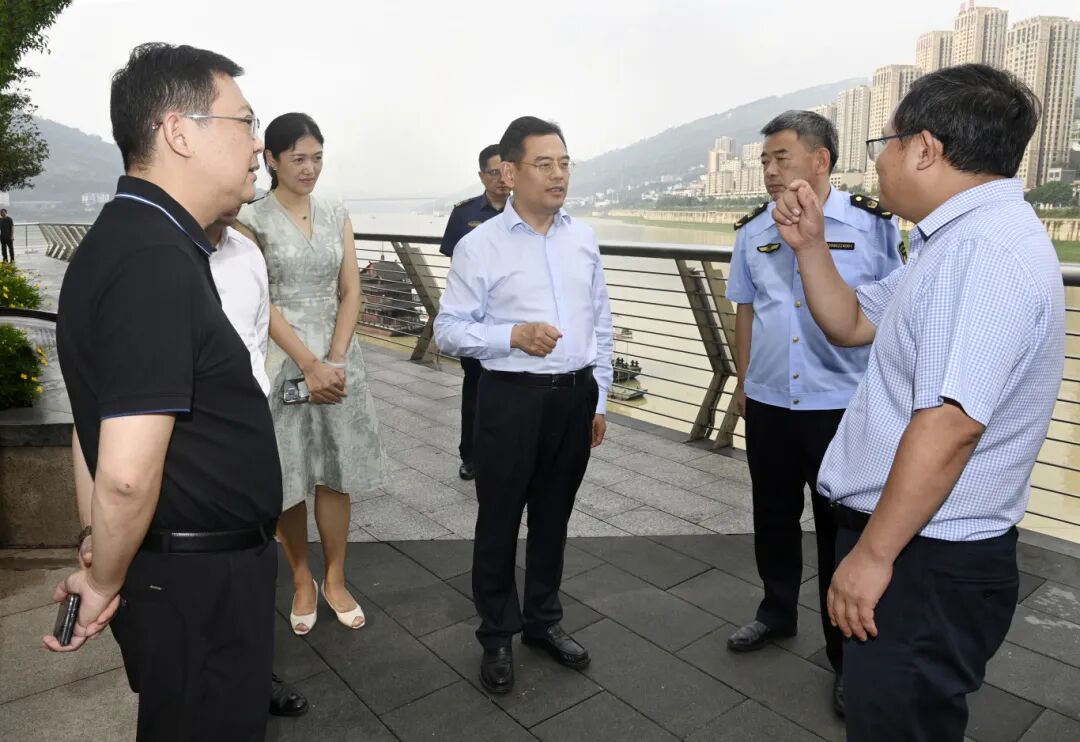 在锦绣洲广场,黎勇等察看长江、乌江涪陵段水位,了解危岩地灾防治情况等