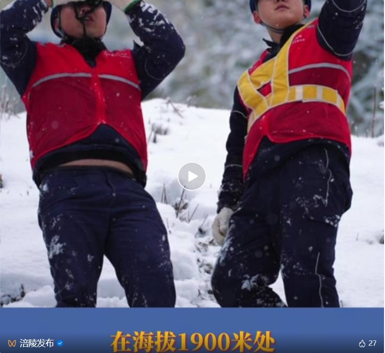 当天一大早,电力工人段一航和队员一起带上望远镜、绝缘棒、砍刀等工具,前往海拔1900米的武陵山山顶涪陵转播台。由于这里海拔较高,部分积雪深达20厘米,只能徒步前行。