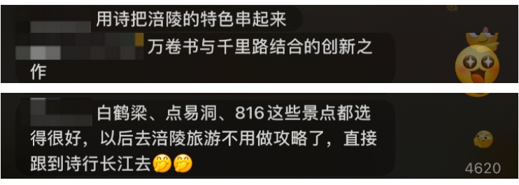 《诗行长江》第二季涪陵篇展现了涪陵独具魅力的人文风貌。节目播出后,有网友说“看完就想去涪陵了”,还有网友为816工程建设中的感人故事而湿润了眼眸。熟悉的涪陵人文风物,用创新的手法和新颖的视角在屏幕上展现,观看节目后的涪陵专家学者和市民纷纷为家乡加油,为创新点赞。